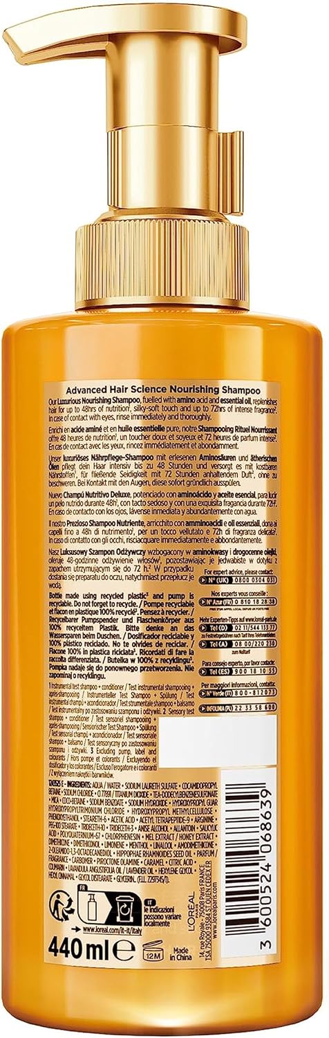Cheveux secs et ternes ? Découvrez le pouvoir de la science dans des soins d’exception pour la plus luxueuse des expériences. Enrichi en acide aminé et en huile essentielle pure, notre gamme Rituel Nourrissant offre 48H de vitamin*, un toucher doux et soyeux et 72H de parfum intense** Résultats : vitamin profonde et brillance miroir. Pour encore plus de résultats, utilisez la routine complète Superior Hair Science avec le Shampooing Rituel Nourissant, le Démêlant Rituel Nourrissant et le Masque Rituel Nourrissant. Notre engagement ne s’arrête pas à la beauté de vos cheveux. Nos flacons sont issus à 100% à partir de plastique recyclé*** et sont recyclables. *take a look at instrumental shampooing + démêlant **take a look at sensoriel shampooing + démêlant ***hors colorants et pompe