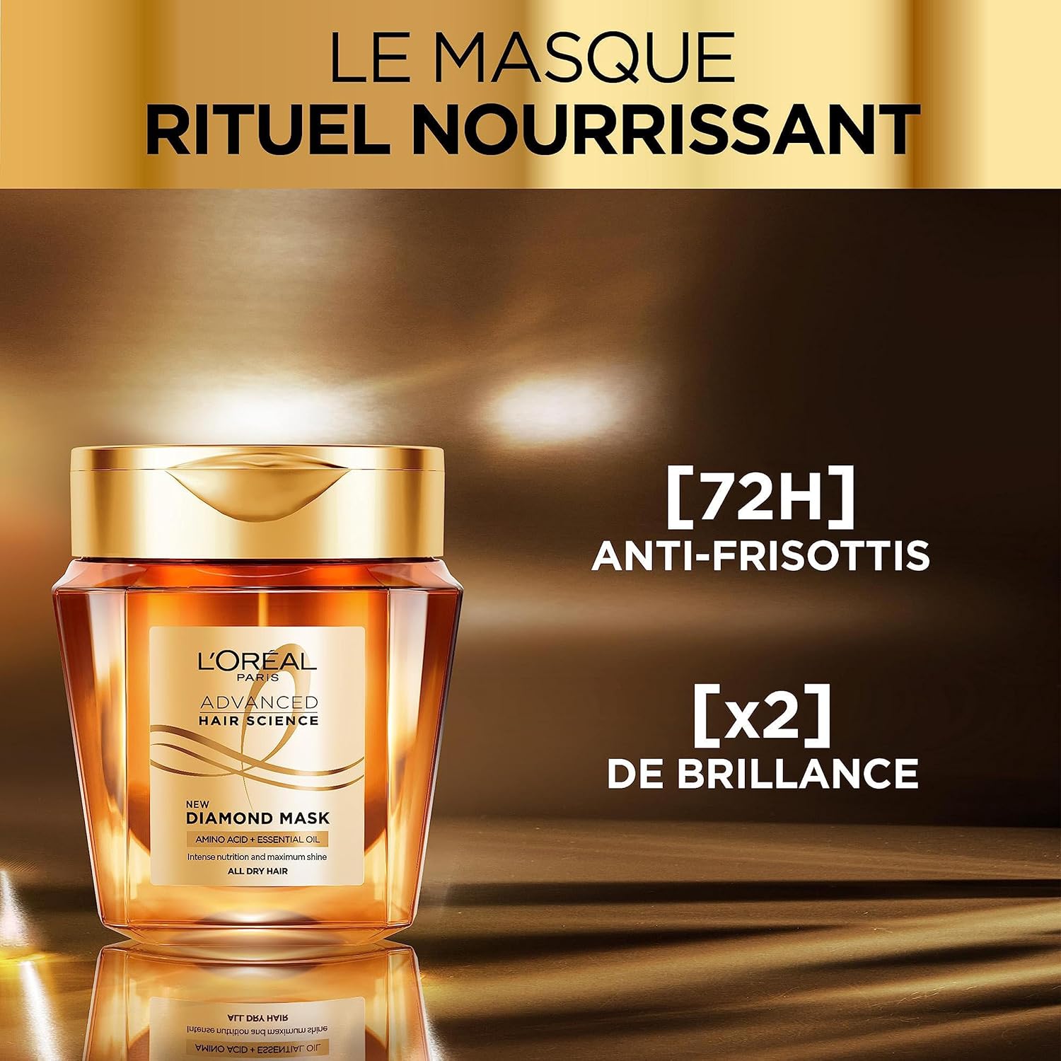 Résultats : Des cheveux nourris intensément pendant 48H, un toucher doux et soyeux, une brillance infinie et un parfum intense qui dure pendant 72H